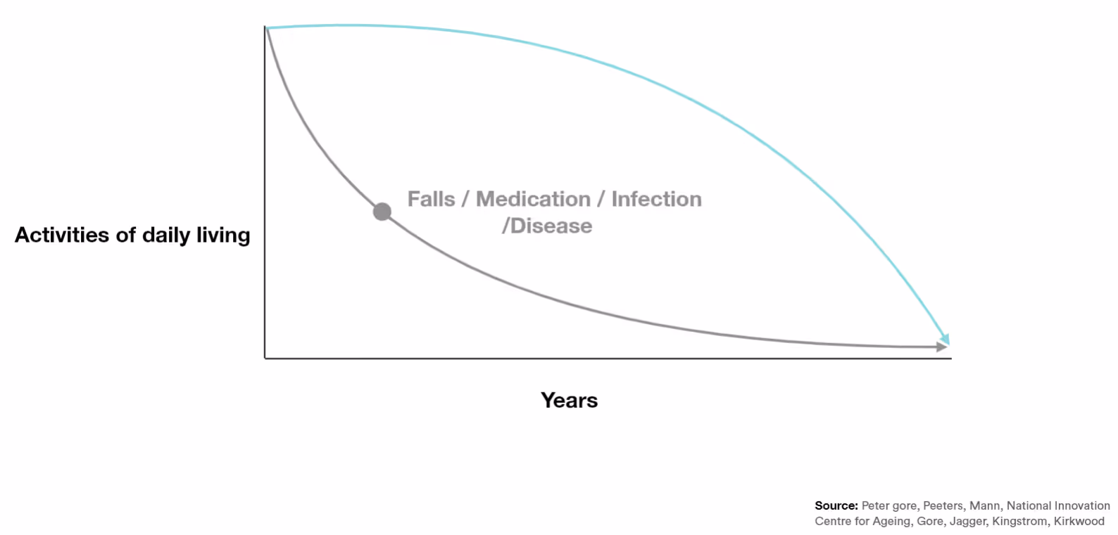 If you look at the shape of the black curve, you see that older adults decline rapidly and then stabilize when they’ve become highly dependent. However, a study by academics from Newcastle University has demonstrated that we could revert the acceleration of adult decline with simple coaching and prevention — that the green curve, giving several healthier years at home and avoiding hospitalisation and its associated costs.