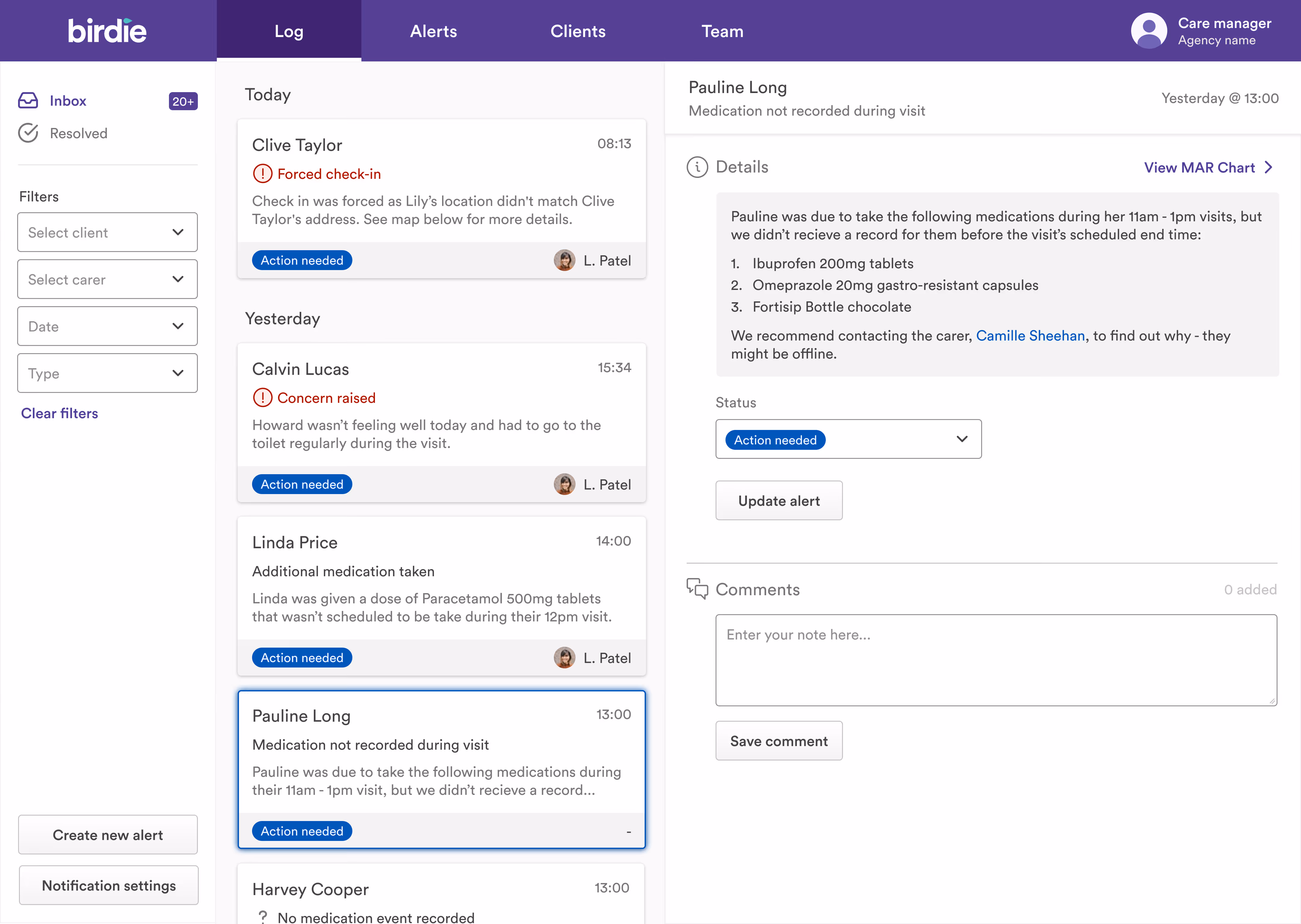 As medications will be associated with specific visits, if a carer doesn't complete medications before the visit's scheduled end time, a single alert will be raised to let you know what's happened. Medication outcomes that haven't been observed on a visit will be grouped into one single alert, reducing the number of alerts into the alert manager. It'll enable you to respond to the most urgent alerts first, making it easier for you to assess, prioritise, and make changes to the schedules as needed. Separate alerts will still be raised for late or forced check-ins.