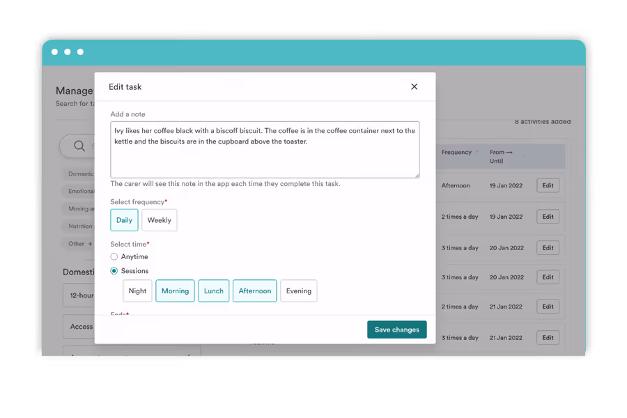 To provide more person-centred care, you can customise a task by adding notes and selecting the frequency and timeline of the tasks.