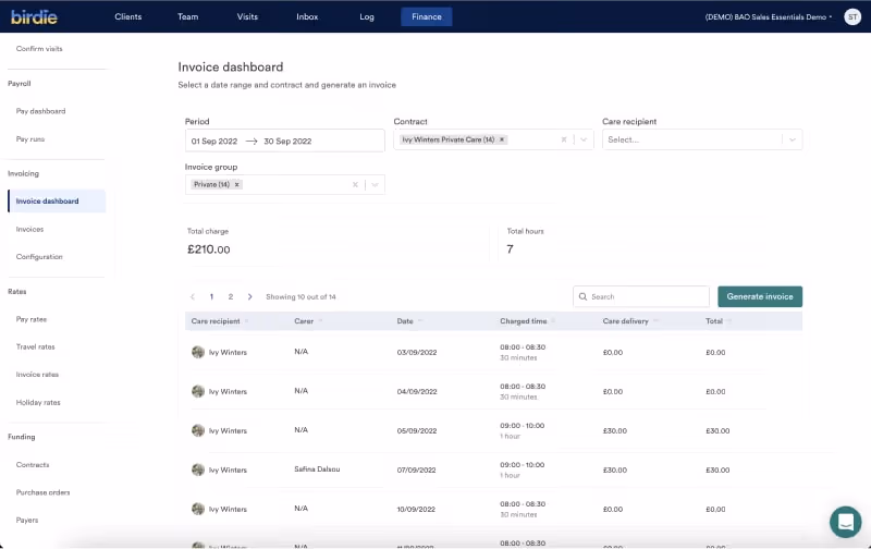 - Flexible invoicing tools allow you to split your invoices across multiple funders, charge additional visit fees and more.